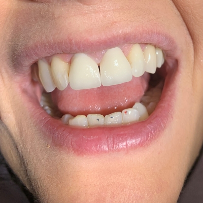 Szóló front foghiány pótlása azonnali implantációval és gyógyulást követően végleges esztétikus cirkon koronákkal.